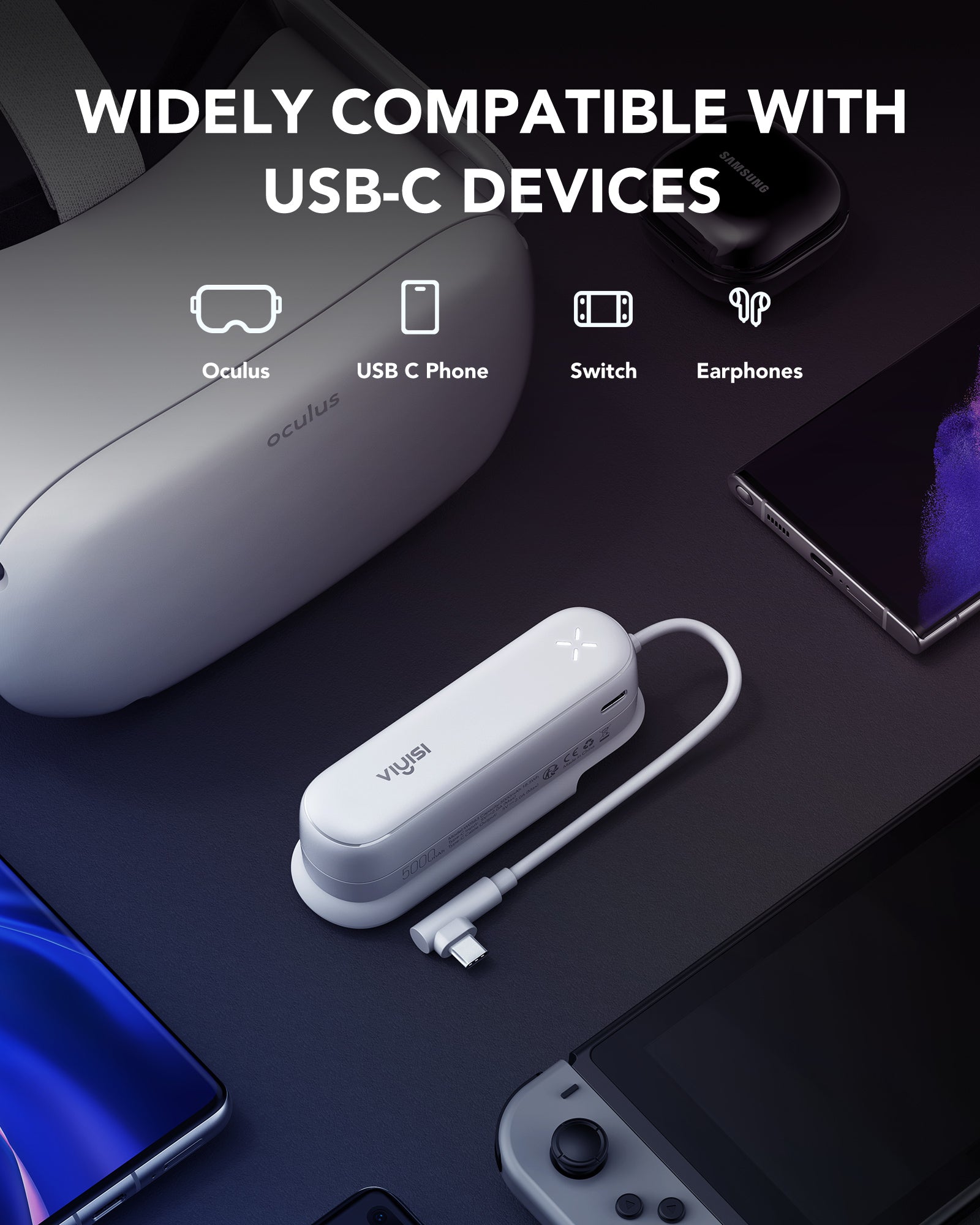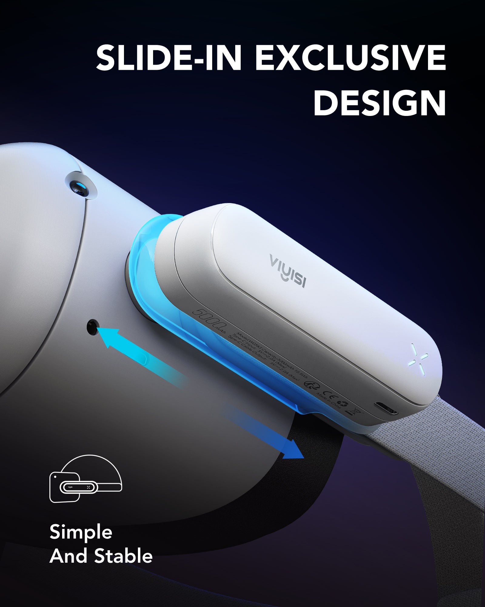Enjoy uninterrupted VR gaming with the 5000mAh Meta Quest Battery Pack, specially designed for Meta Quest 3/3S and Quest 2. The innovative slide-in design ensures a snug fit without blocking the headphone jack, while extending playtime by 2-4 hours. Lightweight and color-matched for a sleek look, it stays securely attached during intense gameplay. Safety-certified and versatile, it doubles as a Type-C power bank for other devices. Perfect for VR enthusiasts seeking longer, hassle-free sessions with their Meta Quest 3/3S and Oculus Quest 2.